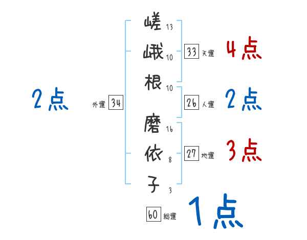 天運![]() | 嵯峨根磨依子さんの天運は33画の4つ星!権力志向でプライドが高い。勇気があり運を切り開き成功する。 家系が持つ宿命的な運勢を表します。祖先から受け継いだ苗字ですので自分の力が及びません。家柄を象徴します。 |