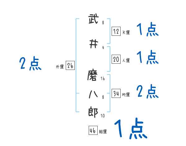 天運![]() | 武井磨八郎さんの天運は12画の1つ星!簡単な失敗で諦めてしまいやすいかも。着実に行動すると良いでしょう。 家系が持つ宿命的な運勢を表します。祖先から受け継いだ苗字ですので自分の力が及びません。家柄を象徴します。 |