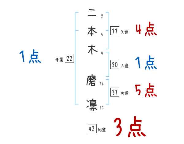 総運![]() | 二本木磨凛さんの総運は42画の3つ星!病気に注意。多芸であるが消極的でおとなしい。 あなたの人生を表す1番重要な運勢です。生涯を通じて影響する総合運となり、主に50歳以降の晩年期に影響を及ぼします。 |