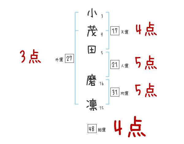天運![]() | 小茂田磨凛さんの天運は17画の4つ星!積極的な行動力。地位を気づき財産を手に入れる。純粋な心と直感力。 家系が持つ宿命的な運勢を表します。祖先から受け継いだ苗字ですので自分の力が及びません。家柄を象徴します。 |