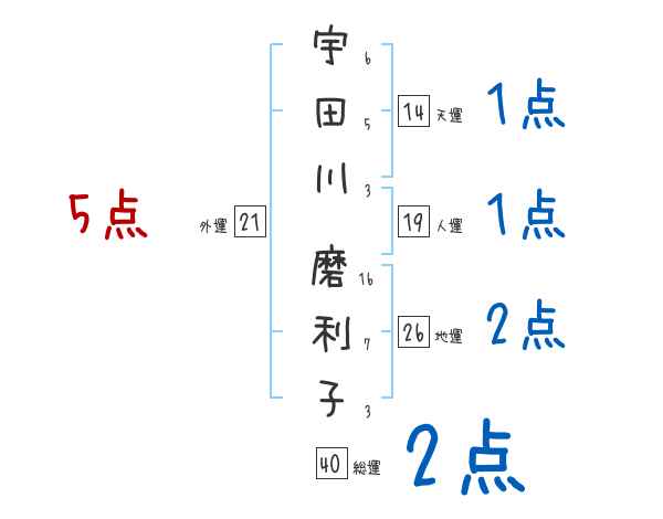 外運![]() | 宇田川磨利子さんの外運は21画の5つ星!統率力がある。独立し成功する。名誉を手に入れる。 生活面を象徴する運勢です。外部から受ける影響力を表し、結婚運、家庭運や職場、環境への順応性を表します。 |