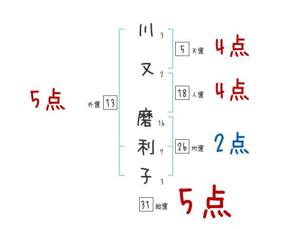 天運![]() | 川又磨利子さんの天運は5画の4つ星!健康で安泰。協調性に優れ、財産に恵まれる。 家系が持つ宿命的な運勢を表します。祖先から受け継いだ苗字ですので自分の力が及びません。家柄を象徴します。 |