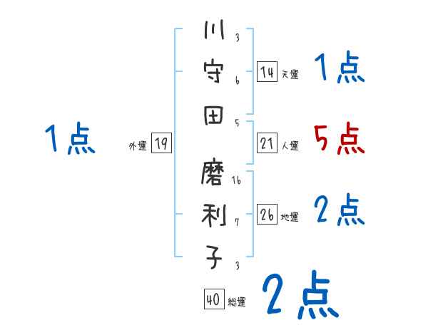総運![]() | 川守田磨利子さんの総運は40画の2つ星!自信過剰で物事に固執するためトラブルに注意。 あなたの人生を表す1番重要な運勢です。生涯を通じて影響する総合運となり、主に50歳以降の晩年期に影響を及ぼします。 |