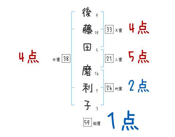 天運![]() | 後藤田磨利子さんの天運は33画の4つ星!権力志向でプライドが高い。勇気があり運を切り開き成功する。 家系が持つ宿命的な運勢を表します。祖先から受け継いだ苗字ですので自分の力が及びません。家柄を象徴します。 |