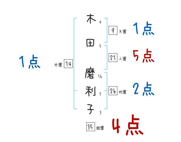 外運![]() | 木田磨利子さんの外運は14画の1つ星!人に対して優しいがストレスを溜め込みがち。人間関係のトラブルを避けるよう気をつけましょう。 生活面を象徴する運勢です。外部から受ける影響力を表し、結婚運、家庭運や職場、環境への順応性を表します。 |