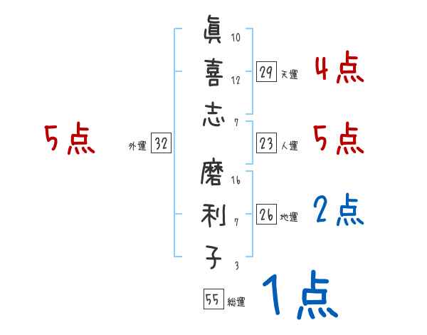 外運![]() | 眞喜志磨利子さんの外運は32画の5つ星!柔軟性があり成功する。チャンスが多く金運が良い。 生活面を象徴する運勢です。外部から受ける影響力を表し、結婚運、家庭運や職場、環境への順応性を表します。 |