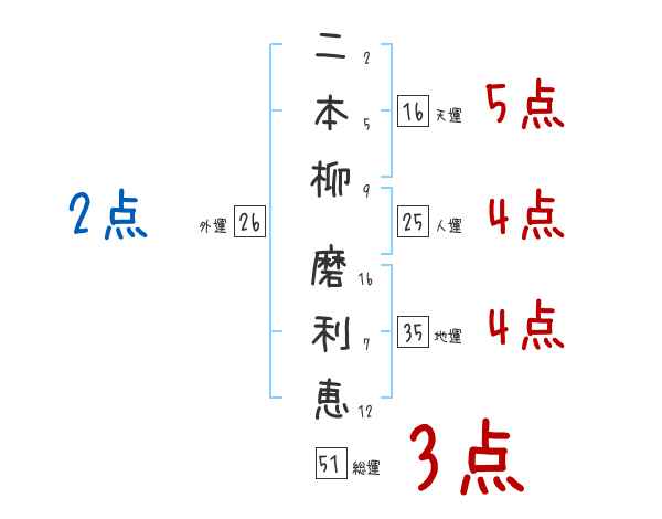 天運![]() | 二本柳磨利恵さんの天運は16画の5つ星!人望が厚く大きく発展する。逆転成功が見える。 家系が持つ宿命的な運勢を表します。祖先から受け継いだ苗字ですので自分の力が及びません。家柄を象徴します。 |
