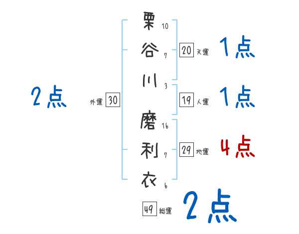 地運![]() | 栗谷川磨利衣さんの地運は29画の4つ星!完全主義で才能がある。厳格な心の持ち主。 個性を表す基礎的な運勢です。性格形成や対人関係、行動力など家庭環境に影響されます。主に誕生してから20歳くらいまでの若年期の運勢を表します。 |