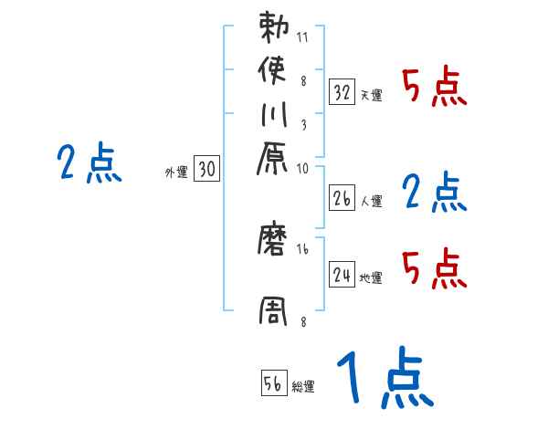 天運![]() | 勅使川原磨周さんの天運は32画の5つ星!柔軟性があり成功する。チャンスが多く金運が良い。 家系が持つ宿命的な運勢を表します。祖先から受け継いだ苗字ですので自分の力が及びません。家柄を象徴します。 |