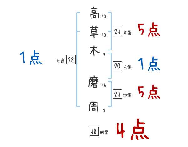 外運![]() | 高草木磨周さんの外運は28画の1つ星!家庭環境に注意。スポーツで活躍できる能力があるかも。 生活面を象徴する運勢です。外部から受ける影響力を表し、結婚運、家庭運や職場、環境への順応性を表します。 |
