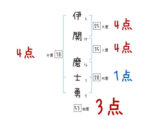 総運![]() | 伊関磨士勇さんの総運は53画の3つ星!やや見栄っ張りで虚栄心がある。散財に注意。 あなたの人生を表す1番重要な運勢です。生涯を通じて影響する総合運となり、主に50歳以降の晩年期に影響を及ぼします。 |