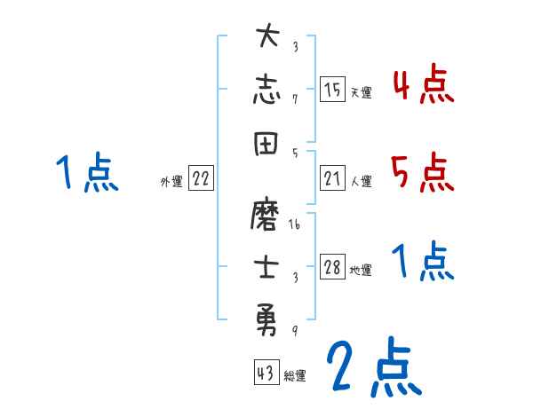 総運![]() | 大志田磨士勇さんの総運は43画の2つ星!頑固な性格で独立心が強いかも。やや非現実的で浪費に注意しましょう。 あなたの人生を表す1番重要な運勢です。生涯を通じて影響する総合運となり、主に50歳以降の晩年期に影響を及ぼします。 |