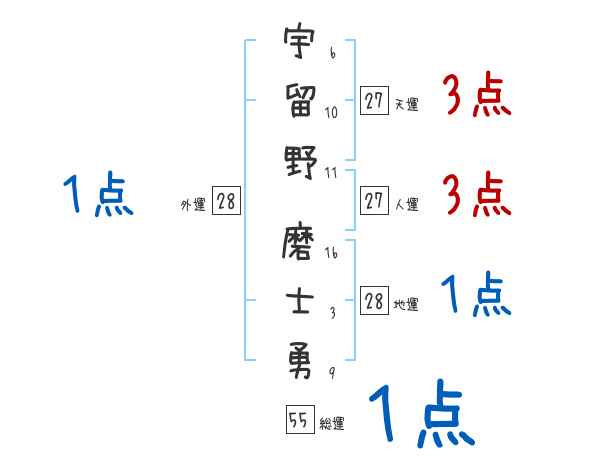 地運![]() | 宇留野磨士勇さんの地運は28画の1つ星!家庭環境に注意。スポーツで活躍できる能力があるかも。 個性を表す基礎的な運勢です。性格形成や対人関係、行動力など家庭環境に影響されます。主に誕生してから20歳くらいまでの若年期の運勢を表します。 |