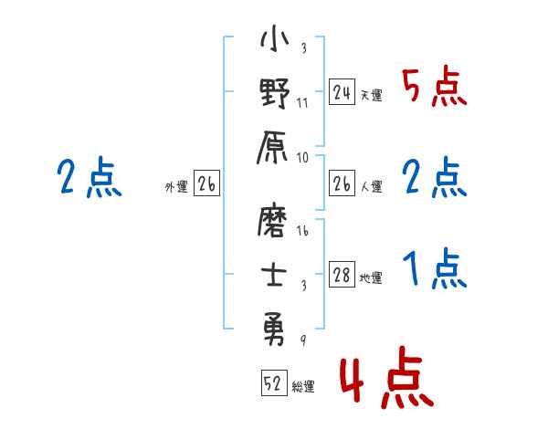 地運![]() | 小野原磨士勇さんの地運は28画の1つ星!家庭環境に注意。スポーツで活躍できる能力があるかも。 個性を表す基礎的な運勢です。性格形成や対人関係、行動力など家庭環境に影響されます。主に誕生してから20歳くらいまでの若年期の運勢を表します。 |