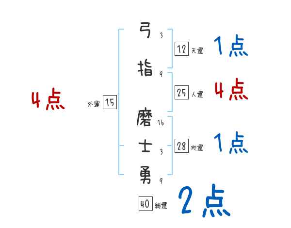 外運![]() | 弓指磨士勇さんの外運は15画の4つ星!人徳があり出世する。順調に物事を進め円満な人生。 生活面を象徴する運勢です。外部から受ける影響力を表し、結婚運、家庭運や職場、環境への順応性を表します。 |