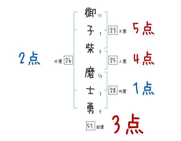 御子柴磨士勇さんの画数の鑑定結果