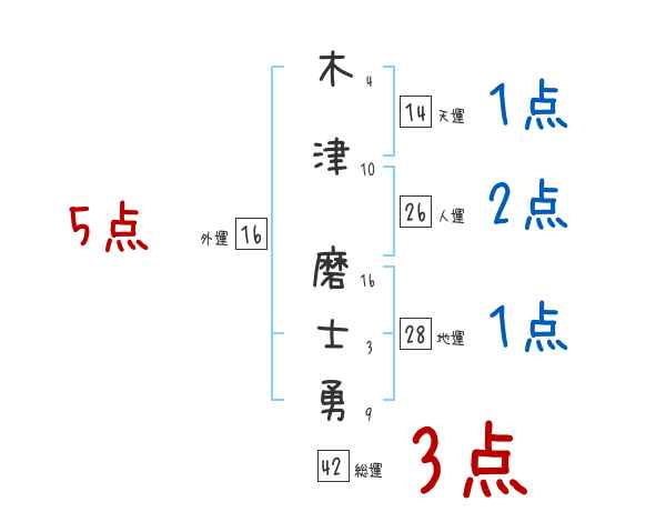 外運![]() | 木津磨士勇さんの外運は16画の5つ星!人望が厚く大きく発展する。逆転成功が見える。 生活面を象徴する運勢です。外部から受ける影響力を表し、結婚運、家庭運や職場、環境への順応性を表します。 |