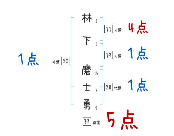 天運![]() | 林下磨士勇さんの天運は11画の4つ星!着実に富や地位を得る幸運な人生。 家系が持つ宿命的な運勢を表します。祖先から受け継いだ苗字ですので自分の力が及びません。家柄を象徴します。 |
