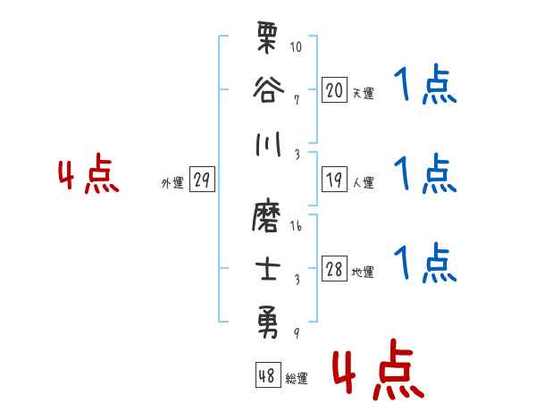 外運![]() | 栗谷川磨士勇さんの外運は29画の4つ星!完全主義で才能がある。厳格な心の持ち主。 生活面を象徴する運勢です。外部から受ける影響力を表し、結婚運、家庭運や職場、環境への順応性を表します。 |