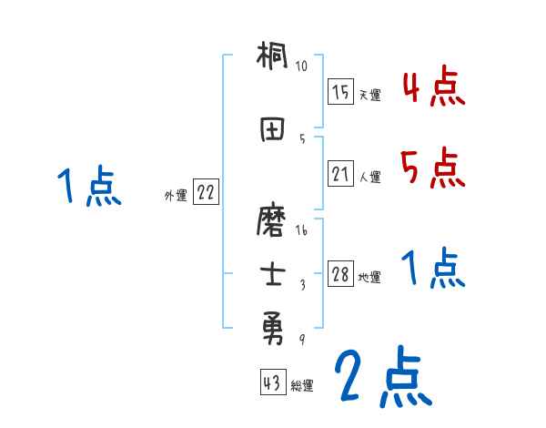 外運![]() | 桐田磨士勇さんの外運は22画の1つ星!努力することが苦手ないっぽう手先が器用。芸術性にも優れる。 生活面を象徴する運勢です。外部から受ける影響力を表し、結婚運、家庭運や職場、環境への順応性を表します。 |