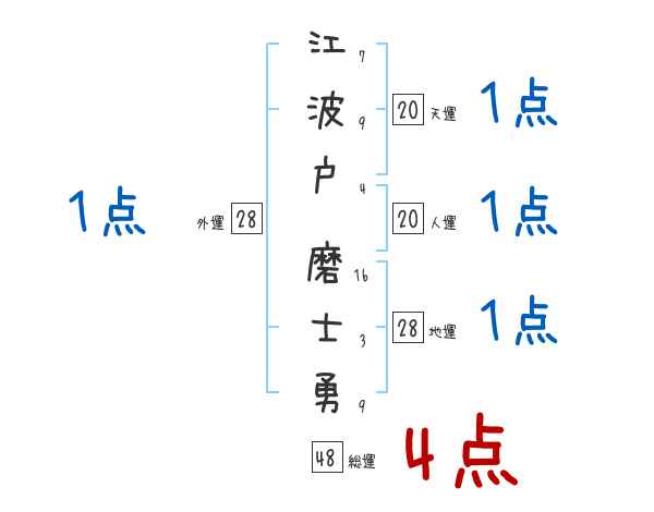 地運![]() | 江波戸磨士勇さんの地運は28画の1つ星!家庭環境に注意。スポーツで活躍できる能力があるかも。 個性を表す基礎的な運勢です。性格形成や対人関係、行動力など家庭環境に影響されます。主に誕生してから20歳くらいまでの若年期の運勢を表します。 |