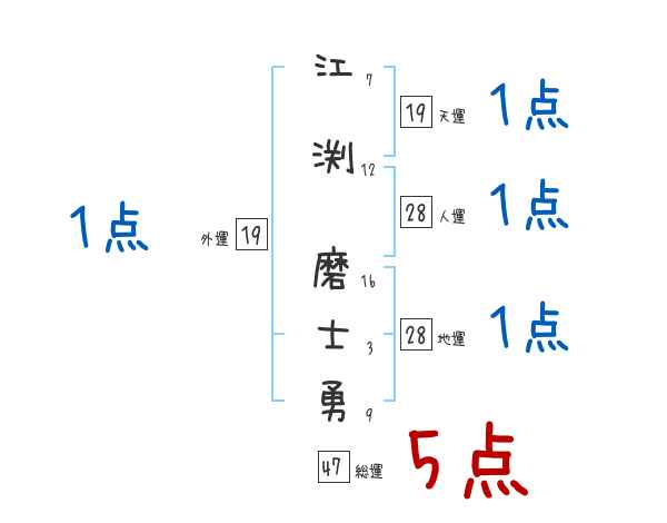 総運![]() | 江渕磨士勇さんの総運は47画の5つ星!実力が開花し発展する円満な人生。財に恵まれる。 あなたの人生を表す1番重要な運勢です。生涯を通じて影響する総合運となり、主に50歳以降の晩年期に影響を及ぼします。 |