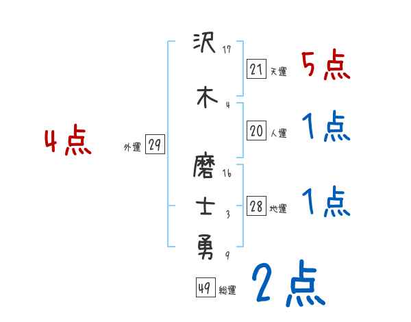 外運![]() | 沢木磨士勇さんの外運は29画の4つ星!完全主義で才能がある。厳格な心の持ち主。 生活面を象徴する運勢です。外部から受ける影響力を表し、結婚運、家庭運や職場、環境への順応性を表します。 |