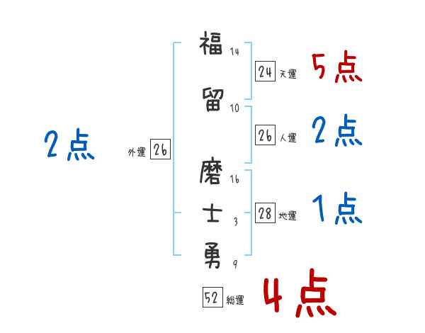 天運![]()  | 福留磨士勇さんの天運は24画の5つ星!家庭運が良く順調な人生。金運にも恵まれる。 家系が持つ宿命的な運勢を表します。祖先から受け継いだ苗字ですので自分の力が及びません。家柄を象徴します。 |