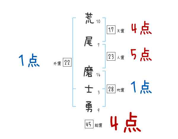 外運![]() | 荒尾磨士勇さんの外運は22画の1つ星!努力することが苦手ないっぽう手先が器用。芸術性にも優れる。 生活面を象徴する運勢です。外部から受ける影響力を表し、結婚運、家庭運や職場、環境への順応性を表します。 |