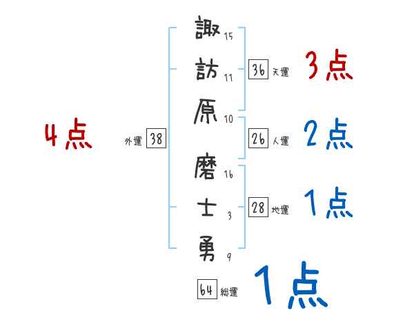 地運![]() | 諏訪原磨士勇さんの地運は28画の1つ星!家庭環境に注意。スポーツで活躍できる能力があるかも。 個性を表す基礎的な運勢です。性格形成や対人関係、行動力など家庭環境に影響されます。主に誕生してから20歳くらいまでの若年期の運勢を表します。 |