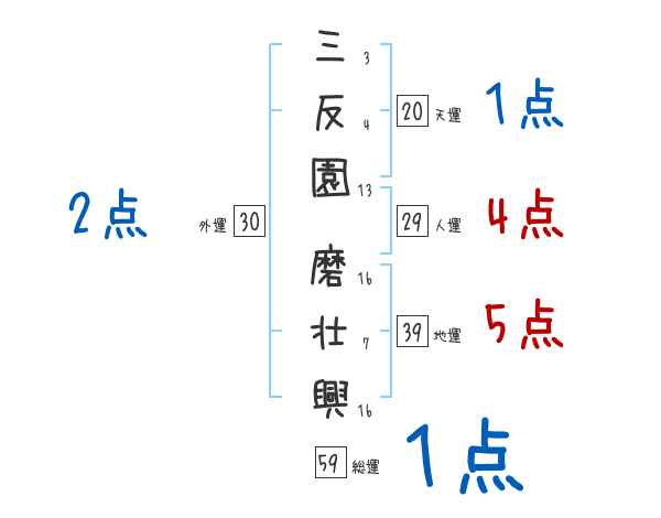 人運![]() | 三反園磨壮興さんの人運は29画の4つ星!完全主義で才能がある。厳格な心の持ち主。 性格や才能などを表す2番目に重要な運勢です。人間関係や協調性、社会的な成功に影響します。主に20歳から50歳ぐらいまでの中年期の運勢を表します。 |