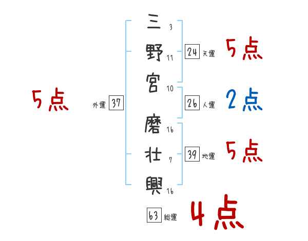 天運![]() | 三野宮磨壮興さんの天運は24画の5つ星!家庭運が良く順調な人生。金運にも恵まれる。 家系が持つ宿命的な運勢を表します。祖先から受け継いだ苗字ですので自分の力が及びません。家柄を象徴します。 |