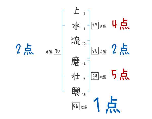 総運![]() | 上水流磨壮興さんの総運は56画の1つ星!消極的で無気力になりがち。誠実な気持ちが必要でしょう。 あなたの人生を表す1番重要な運勢です。生涯を通じて影響する総合運となり、主に50歳以降の晩年期に影響を及ぼします。 |