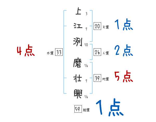 地運![]() | 上江洌磨壮興さんの地運は39画の5つ星!社交性に優れ人望が厚い。人の上に立ち成功する。 個性を表す基礎的な運勢です。性格形成や対人関係、行動力など家庭環境に影響されます。主に誕生してから20歳くらいまでの若年期の運勢を表します。 |
