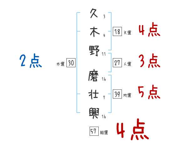 天運![]() | 久木野磨壮興さんの天運は18画の4つ星!情熱的で剛気。忍耐力があり信頼される。 家系が持つ宿命的な運勢を表します。祖先から受け継いだ苗字ですので自分の力が及びません。家柄を象徴します。 |