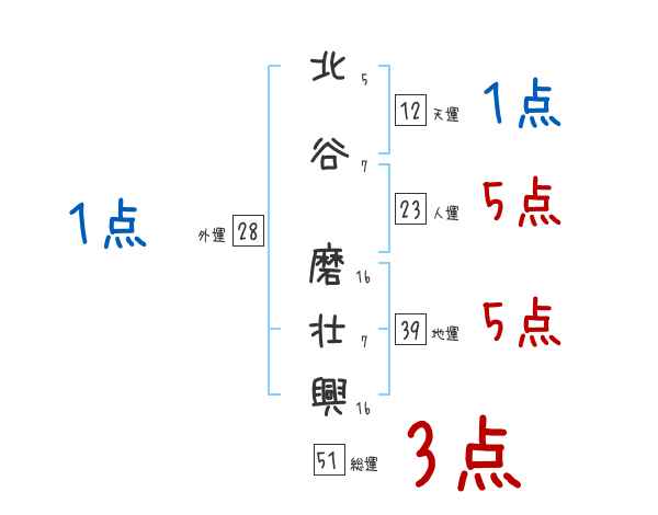 地運![]() | 北谷磨壮興さんの地運は39画の5つ星!社交性に優れ人望が厚い。人の上に立ち成功する。 個性を表す基礎的な運勢です。性格形成や対人関係、行動力など家庭環境に影響されます。主に誕生してから20歳くらいまでの若年期の運勢を表します。 |