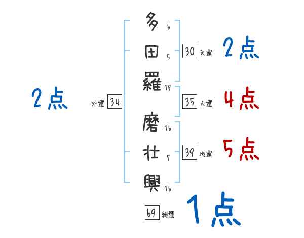 総運![]() | 多田羅磨壮興さんの総運は69画の1つ星!不満を感じやすい傾向が。ストレスを貯めないように注意しましょう。 あなたの人生を表す1番重要な運勢です。生涯を通じて影響する総合運となり、主に50歳以降の晩年期に影響を及ぼします。 |