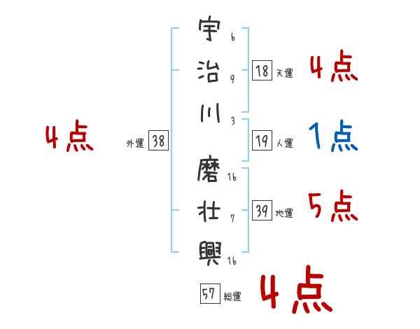 天運![]() | 宇治川磨壮興さんの天運は18画の4つ星!情熱的で剛気。忍耐力があり信頼される。 家系が持つ宿命的な運勢を表します。祖先から受け継いだ苗字ですので自分の力が及びません。家柄を象徴します。 |