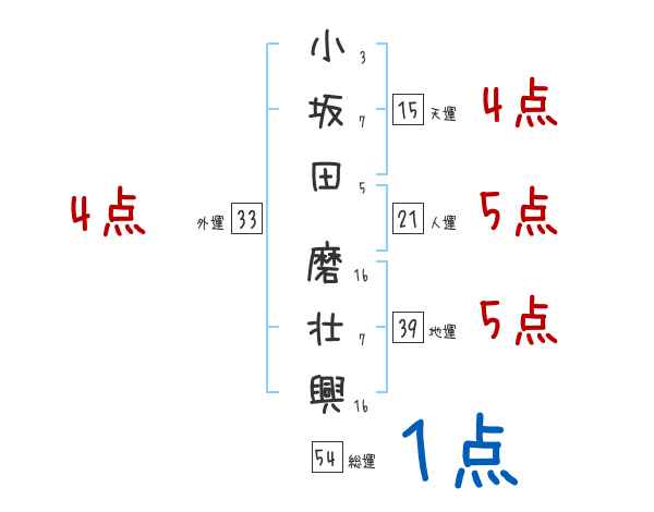 天運![]() | 小坂田磨壮興さんの天運は15画の4つ星!人徳があり出世する。順調に物事を進め円満な人生。 家系が持つ宿命的な運勢を表します。祖先から受け継いだ苗字ですので自分の力が及びません。家柄を象徴します。 |