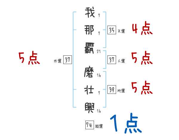 天運![]() | 我那覇磨壮興さんの天運は35画の4つ星!温厚な性格で感受性が高い。穏和な性格で人望が厚い。 家系が持つ宿命的な運勢を表します。祖先から受け継いだ苗字ですので自分の力が及びません。家柄を象徴します。 |