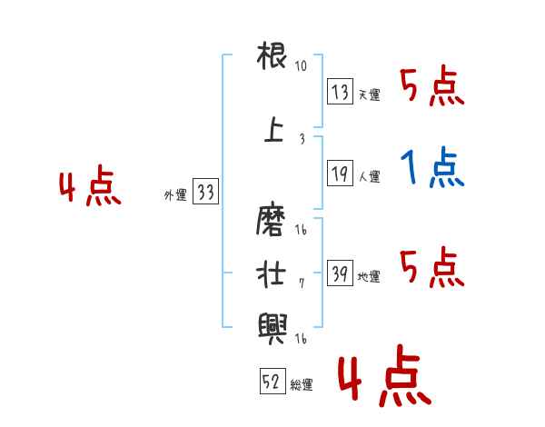 外運![]() | 根上磨壮興さんの外運は33画の4つ星!権力志向でプライドが高い。勇気があり運を切り開き成功する。 生活面を象徴する運勢です。外部から受ける影響力を表し、結婚運、家庭運や職場、環境への順応性を表します。 |