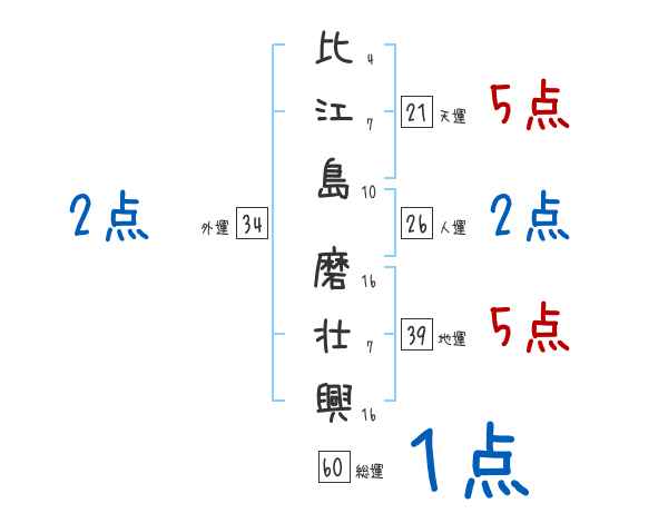 人運![]() | 比江島磨壮興さんの人運は26画の2つ星!波瀾万丈かも。信頼できる人を大事にしましょう。 性格や才能などを表す2番目に重要な運勢です。人間関係や協調性、社会的な成功に影響します。主に20歳から50歳ぐらいまでの中年期の運勢を表します。 |