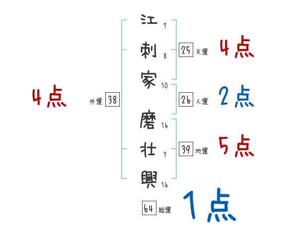 天運![]() | 江刺家磨壮興さんの天運は25画の4つ星!個性があり才能があふれる。強運の持ち主で発展する。 家系が持つ宿命的な運勢を表します。祖先から受け継いだ苗字ですので自分の力が及びません。家柄を象徴します。 |