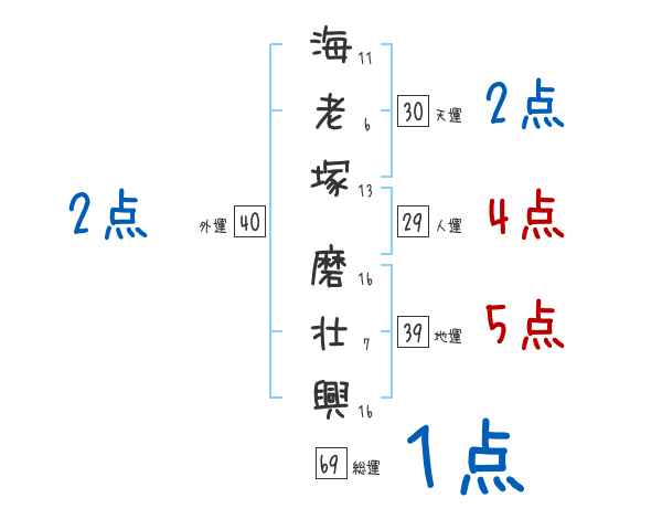 総運![]() | 海老塚磨壮興さんの総運は69画の1つ星!不満を感じやすい傾向が。ストレスを貯めないように注意しましょう。 あなたの人生を表す1番重要な運勢です。生涯を通じて影響する総合運となり、主に50歳以降の晩年期に影響を及ぼします。 |