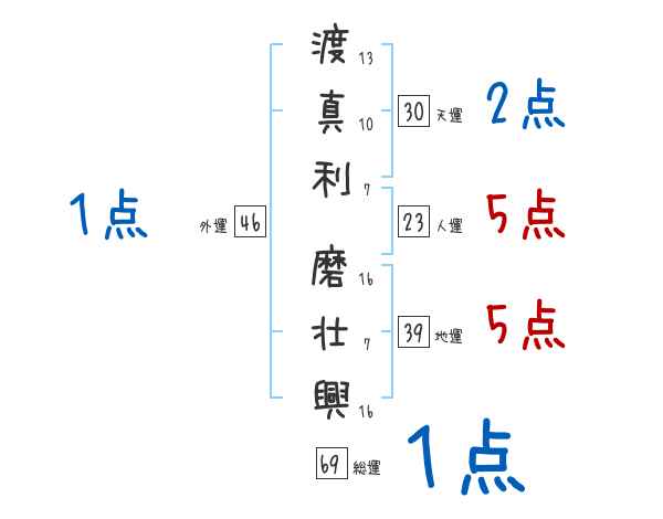 地運![]() | 渡真利磨壮興さんの地運は39画の5つ星!社交性に優れ人望が厚い。人の上に立ち成功する。 個性を表す基礎的な運勢です。性格形成や対人関係、行動力など家庭環境に影響されます。主に誕生してから20歳くらいまでの若年期の運勢を表します。 |