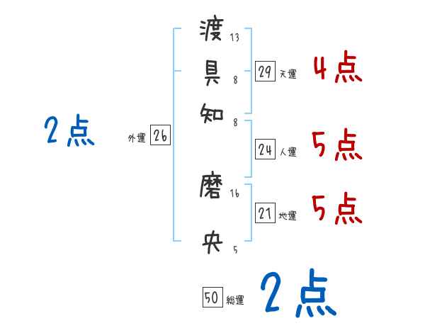外運![]() | 渡具知磨央さんの外運は26画の2つ星!波瀾万丈かも。信頼できる人を大事にしましょう。 生活面を象徴する運勢です。外部から受ける影響力を表し、結婚運、家庭運や職場、環境への順応性を表します。 |
