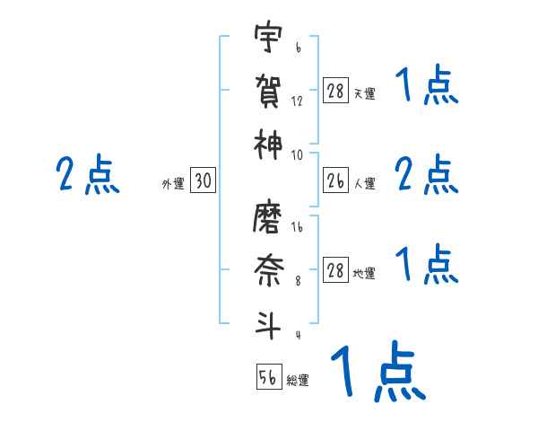 総運![]() | 宇賀神磨奈斗さんの総運は56画の1つ星!消極的で無気力になりがち。誠実な気持ちが必要でしょう。 あなたの人生を表す1番重要な運勢です。生涯を通じて影響する総合運となり、主に50歳以降の晩年期に影響を及ぼします。 |
