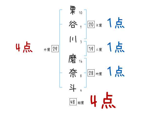 外運![]() | 栗谷川磨奈斗さんの外運は29画の4つ星!完全主義で才能がある。厳格な心の持ち主。 生活面を象徴する運勢です。外部から受ける影響力を表し、結婚運、家庭運や職場、環境への順応性を表します。 |