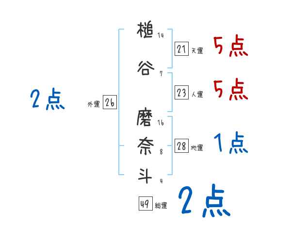 人運![]() | 槌谷磨奈斗さんの人運は23画の5つ星!想像力に優れ活力がある。一代で成功し名誉を手に入れる。 性格や才能などを表す2番目に重要な運勢です。人間関係や協調性、社会的な成功に影響します。主に20歳から50歳ぐらいまでの中年期の運勢を表します。 |