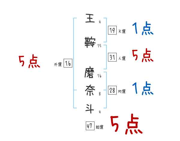 王鞍磨奈斗さんの外運は16画の5つ星